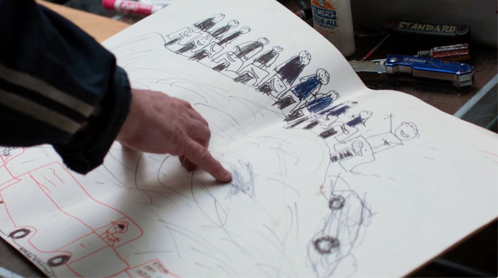 (excerpt from the film) “I did this about 48 years ago… The title is “Apache Motorcycles attacking the food trucks”.